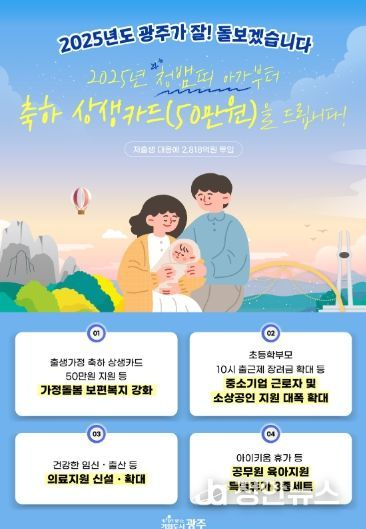 가정돌봄 강화를 위해 2025년 출생아부터 광주시에 출생신고를 한 출생가정에 1인당 50만원의 ‘출생가정 축하 상생카드’ 지원을 사회보장 협의를 거쳐 시행할 계획이다. 이는 생애 초기 양육에 따른 경제적 부담을 줄이고 소상공인과 지역경제 활성화에 도움을 주기 위한 것이다.