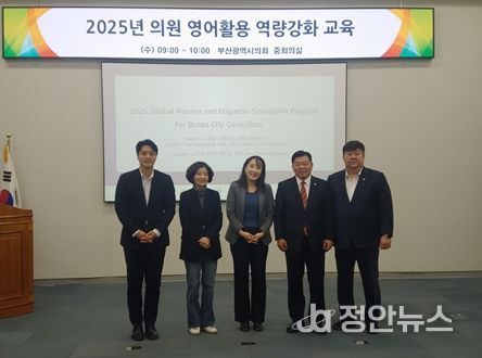 정안뉴스 여지안 기자 | 부산광역시의회는 2025년도 신규역점사업으로 지방시대 및 국제교류활동의 증대를 대비하고, 의원 의정활동 역량 강화를 위해 2월 23일부터 8월까지 6개월간 부산시의회(중회의실)에서 의원 영어활용 역량강화 수업을 시행한다고 밝혔다.