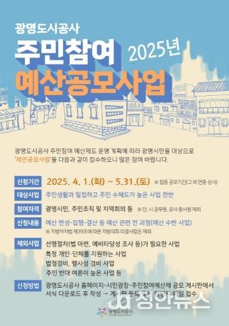 정안뉴스 기자 | 광명도시공사는 시민 참여 및 소통 확대 방안의 하나로, 2026년도 사업예산에 반영할‘2025년도 주민참여예산 공모사업’을 4월부터 5월까지 고객 및 광명시민들을 대상으로 집중 신청받는다고 밝혔다.