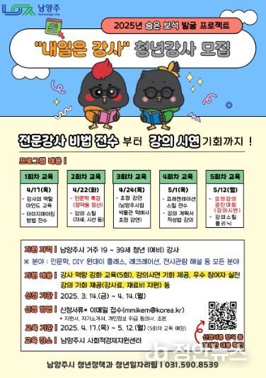 정안뉴스 기자 | 남양주시는 청년 강사들의 역량 강화를 돕는 ‘2025년 숨은 보석 발굴 프로젝트, 내일은 강사’ 사업 참여자 20명을 모집한다.