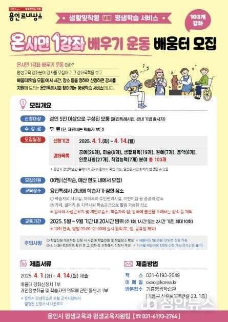 정안뉴스 기자 | 용인특례시는 14일까지 ‘2025년 온시민 1강좌 배우기 운동’에 참여할 배움터를 모집한다고 1일 밝혔다.