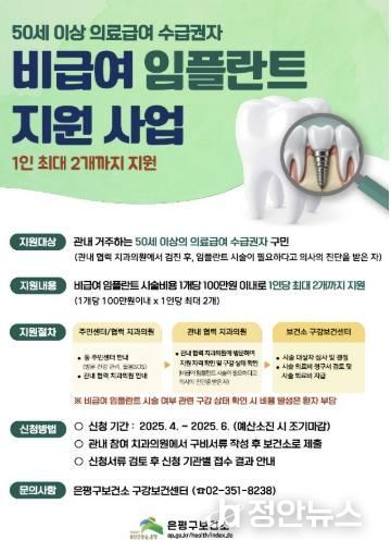 정안뉴스 기자 | 은평구는 50세 이상 의료급여 수급권자를 대상으로 최대 2개까지 비급여 임플란트 시술비를 지원한다고 밝혔다.