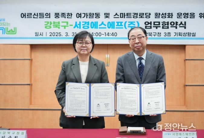 정안뉴스 기자 | 서울 강북구는 지난 3월 31일 구청 기획상황실에서 서경에스에프(주)와 '시니어 맞춤형 이동식 노래반주기 지원‘ 협약을 체결했다고 밝혔다.