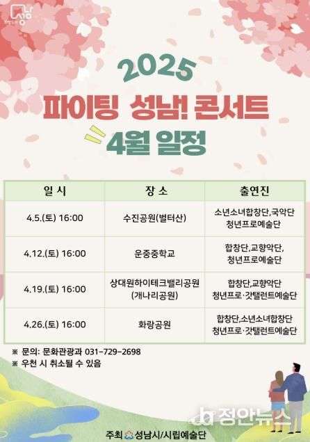 이후 파이팅 성남 콘서트는 △4월 12일 분당구 운중중학교 △4월 19일 중원구 상대원하이테크밸리 개나리공원 △4월 26일 분당구 화랑공원 등에서 열린다. 성남시립교향악단, 성남 청년프로·갓 탤런트 예술단 등이 출연하며, 모두 무료 공연이다.