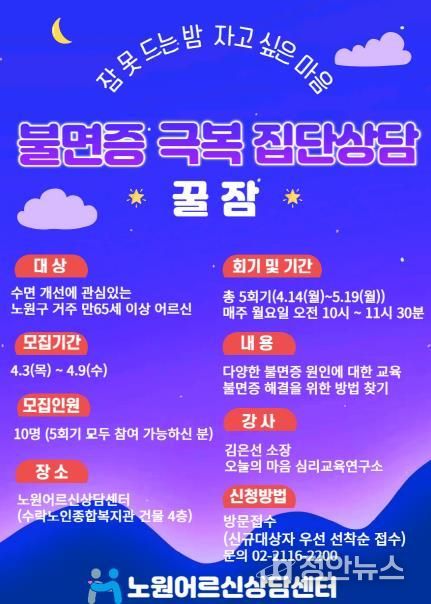 정안뉴스 기자 | 서울 노원구가 불면증으로 고통받는 어르신들을 위해 '이제부터 꿀잠: 건강한 수면 습관 형성 프로그램'을 진행한다고 밝혔다.