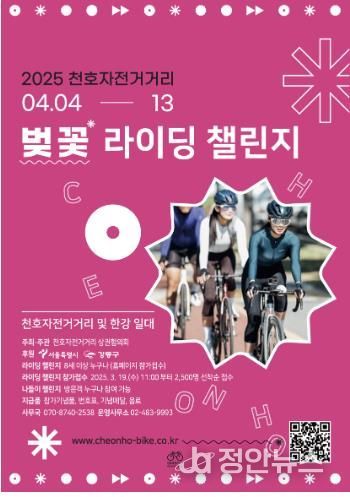 정안뉴스 기자 | 서울 강동구는 오는 4월 4일부터 13일까지 10일간 천호자전거거리와 한강 일대에서 ‘천호자전거거리 벚꽃 라이딩 챌린지’ 행사를 개최한다고 1일 밝혔다.
