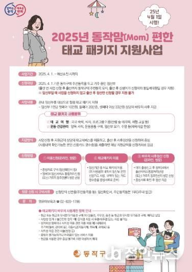 정안뉴스 기자 | 동작구는 저출생 극복과 출산 친화 환경 조성에 앞장서고자 서울시 최초로 ‘동작 맘(Mom) 편한 태교 패키지 지원사업’을 시행한다고 밝혔다.