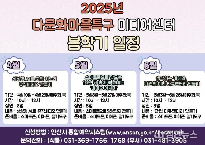 정안뉴스 기자 | 안산시 외국인주민지원본부는 오는 6월까지 다문화마을특구 미디어센터 상반기 영상 콘텐츠 제작 교육 과정을 운영한다고 1일 밝혔다.