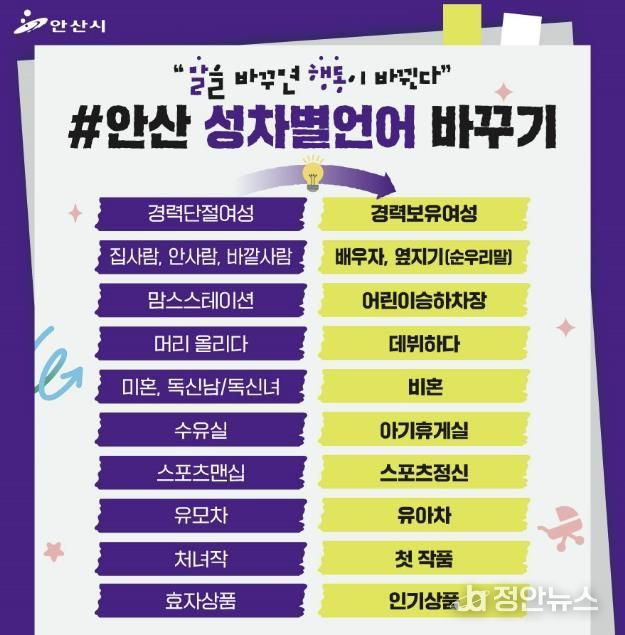 정안뉴스 기자 | 안산시는 최근 성평등한 언어 문화를 확산하고자 ‘시민 제안 성평등 10대 언어’를 선정하고 홍보에 나선다고 1일 밝혔다.