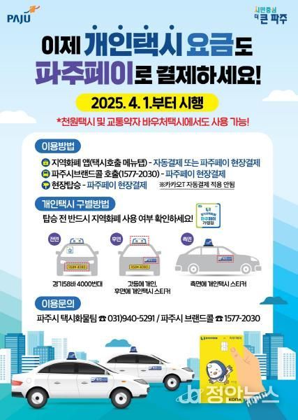 정안뉴스 기자 | 2025년 4월 1일 화요일 9시부터 지역화폐(파주페이)로 개인택시 요금 결제가 가능해진다. 시민들은 경기도 지역화폐(파주페이) 앱이나 브랜드콜을 통해 택시를 호출하거나 길거리에서 택시에 탑승한 후에도 간편하게 지역화폐(파주페이)로 요금을 결제할 수 있다. 단, 카카오티(T) 호출 시 자동결제는 이용이 불가하다.