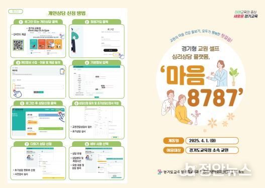 정안뉴스 기자 | 경기도교육청이 1일 도내 교원(13만 2천여 명)의 심리지원과 치유를 위해 교원이 직접 상담을 신청하고 진단받을 수 있는 ‘교원 셀프 심리상담 플랫폼, 마음 8787’ 누리집을 개통했다.