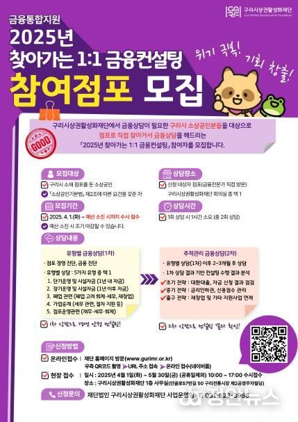 정안뉴스 기자 | 구리시상권활성화재단은 금융 분야에 취약한 소상공인을 위해 맞춤형 진단과 컨설팅을 지원하는'2025년 찾아가는 1:1 금융컨설팅'을 오는 4월 1일부터 시행한다.