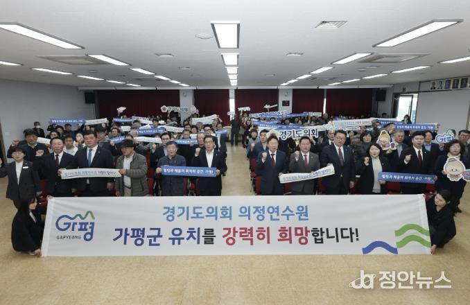 정안뉴스 기자 | 가평군이 경기도의회 의정연수원 유치를 위해 ‘범군민 유치추진단’을 구성하고 총력전에 나섰다. 군은 3월 31일 가평군청에서 ‘경기도의회 의정연수원 범군민 유치추진단 발대식 및 결의대회’를 연데 이어, 이날 경기도의회에 유치 희망서를 공식 접수했다.