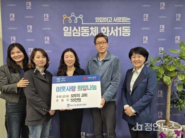 정안뉴스 기자 | 수원시 팔달구 화서1동의 모두의교회가 지역사회 나눔 실천을 위해 화서1동 행정복지센터에 성금 33만 원을 기부했다. 이번 기부금은 화서1동 내 경제적으로 어려움을 겪는 이웃을 돕기 위해 사용될 예정이며, 복지 사각지대에 있는 가정들에게 큰 도움이 될 것으로 기대된다.