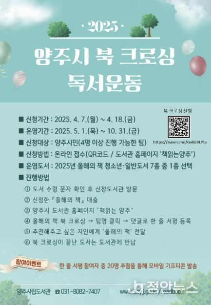 참여를 희망하는 시민은 온라인으로 신청한 뒤, 도서관을 방문해 선정 도서를 대출받아야 한다. 이후 도서관 홈페이지 내 ‘책읽는양주’ 코너에서 ‘올해의 책 북 크로싱’ 팀명을 클릭하고, 한 줄 서평을 댓글로 남기면 된다. 책을 읽은 뒤에는 추천하고 싶은 지인에게 책을 전달하며 북 크로싱을 이어가고, 운동이 끝나면 가까운 도서관에 책을 반납하면 된다.