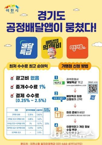정안뉴스 기자 | 이천시는 공공배달앱 ‘배달특급·먹깨비·땡겨요’(이하 배달특급) 가맹점을 집중적으로 모집한다고 밝혔다.
