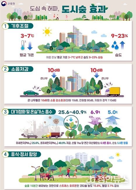 나무 1그루는 공기청정기 10대 및 에어컨 10대 효과가 있으며, 하층숲이 조성된 가로수는 보도 내 온도 4.5℃ 저감효과가 있고 도시숲 안에서 15분 머물 경우 도시숲 밖에서 보다 약 2~3℃ 체온이 저감한다는 다양한 연구결과가 있다. 금년까지 서울시에 조성되는 74,000㎡ 도시바람길숲은 연간 약 51톤의 이산화탄소를 흡수할 것으로 기대된다.