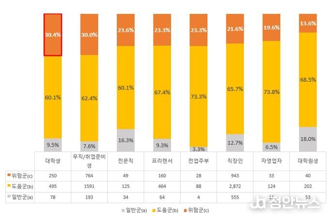 지난해 ‘청년 마음건강 지원사업’ 참여자 대상 간이정신건강진단검사(KSCL95)를 직업군별로 분석한 결과, 동일 집단 내 고위험 비율은 대학생(30.4%), 무직/취업준비생(30.0%) 순으로 높았다. 청소년에서 성인으로 이행하는 과도기의 대학생들이 진로, 취업, 대인관계, 삶의 방향 설정 등 다양한 이유로 심리적 위기를 겪고 있는 것으로 보인다.