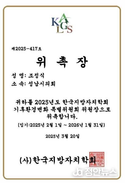 정안뉴스 기자 | 성남시의회 조정식 의원이 (사)한국지방자치학회의 2025년도 기후환경변화 특별위원회 위원장으로 위촉됐다. 임기는 2025년 2월 1일부터 2026년 1월 31일까지다.