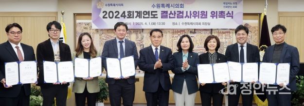 정안뉴스 기자 | 수원특례시의회가 1일 의장 집무실에서 ‘2024회계연도 결산 검사 위원 위촉식’을 진행했다. 이날 시의회는 결산 검사 위원으로 수원특례시의회 사정희 의원과 이대선 의원, 민간 위원으로 박연희·서현일·양헌태·이상준 세무사와 이수승 회계사 등 총 7명의 위원을 위촉했다.