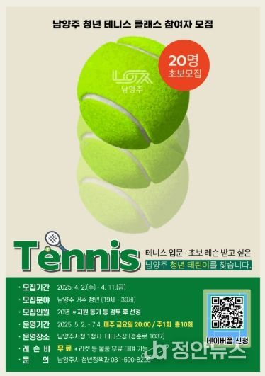 정안뉴스 기자 | 남양주시는 오는 2일부터 10일까지, 청년들의 건강한 신체 활동을 지원하기 위한 ‘청년 테니스 클래스’ 참가자를 모집한다고 1일 밝혔다.