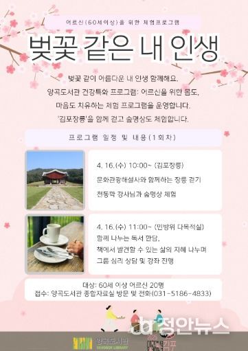 양곡도서관 관계자는 “이번 행사는 우리 모두의 벚꽃 같은 인생을 위한 프로그램으로, 꽃이 만개하는 봄날 장릉을 함께 걷고 독서 심리 상담을 진행할 예정이다”라며, “장릉에서의 숲명상으로 몸과 마음 모두 건강해지는 하루가 될 것”이라고 말했다.