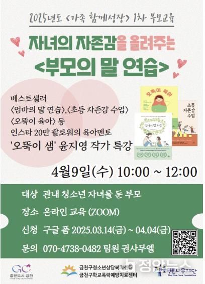 정안뉴스 기자 | 금천구는 금천구청소년상담복지센터에서 4월 9일 수요일 오전 10시 자녀의 자존감을 올려주는 ‘부모의 말 연습’ 온라인 교육을 실시한다고 밝혔다.