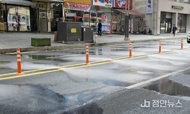 시는 금령로의 농협중앙회~중앙지구대 사이 700m를 4구간으로 나눠 이 장치를 설치했다. 시민들이 이용하는 횡단보도에는 살수가 되지 않는다.