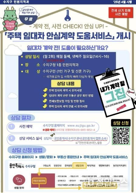 상담은 수지구 공인중개사협회 소속 ‘안전 전세 관리단’의 공인중개사들이 상담 매니저로 참여해 재능기부 형식으로 진행한다. 수지구민 누구나 무료로 이용할 수 있다.
