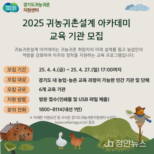 정안뉴스 기자 | 경기도귀농귀촌지원센터는 4일부터 27일까지 24일간 ‘2025 귀농귀촌설계 아카데미’ 참여 교육기관 6곳을 모집한다.