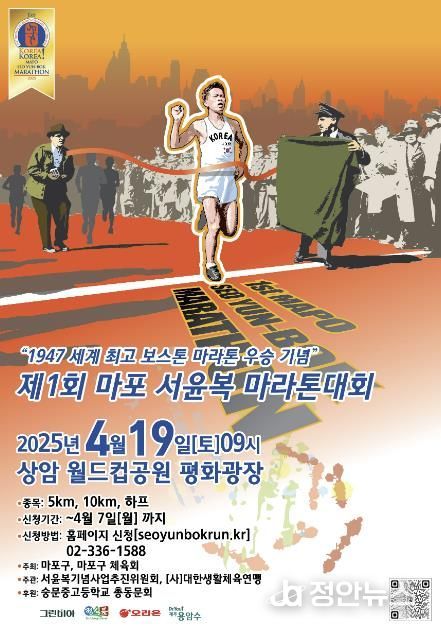 정안뉴스 기자 | 2025년 4월 19일 마포구 월드컵공원에서 열리는 ‘제1회 마포 서윤복 마라톤 대회’(이하 ‘서윤복 마라톤’이라 함.)가 오는 4월 7일까지 참가 신청을 받는다.
