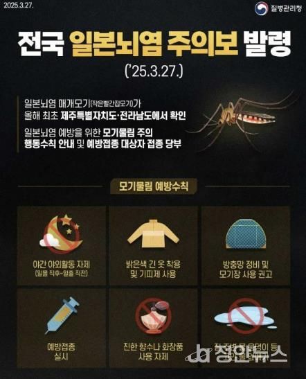 질병관리청에 따르면 일본뇌염 매개모기인 ‘작은빨간집모기’가 최근 제주특별자치도와 전라남도에서 확인됨에 따라 지난달 27일 자로 전국에 일본뇌염 주의보를 발령했다.
