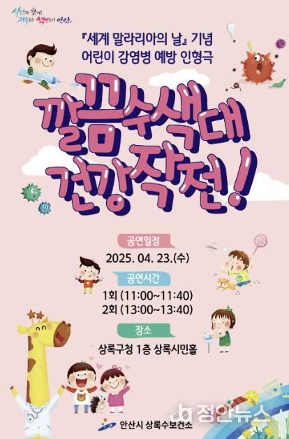 정안뉴스 기자 | 안산시 상록수보건소는 오는 23일 세계 말라리아의 날(4월 25일)을 맞아 감염병 예방 인형극을 개최한다고 2일 밝혔다.