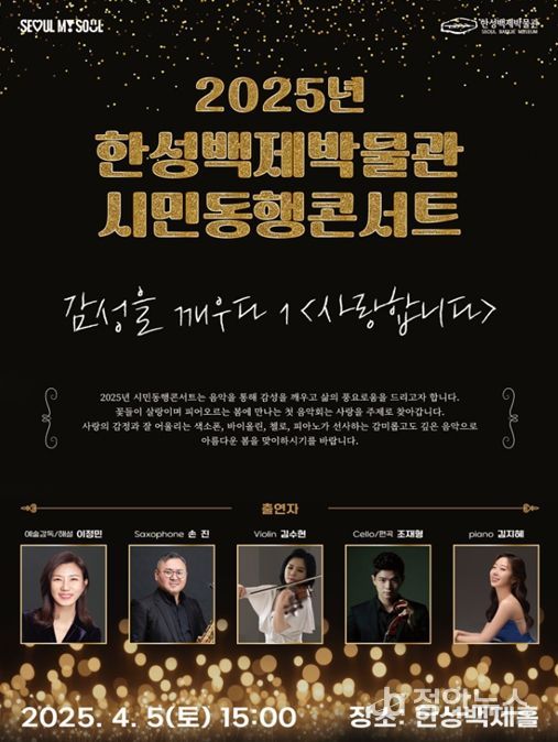정안뉴스 기자 | 서울시 한성백제박물관은 토요일, 여유로운 주말을 맞이한 시민들이 문화로 감성을 채울 수 있도록 무료 음악회 ‘시민동행콘서트’를 올해 4월부터 11월까지 총 4회(4월 5일, 7월 5일, 9월 13일, 11월 8일)개최한다.