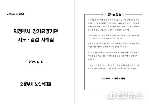 정안뉴스 기자 | 의정부시는 노인장기요양기관의 법령 및 지침 준수를 지원하기 위해 ‘노인장기요양기관 지도‧점검 사례집’을 제작해 배포한다.