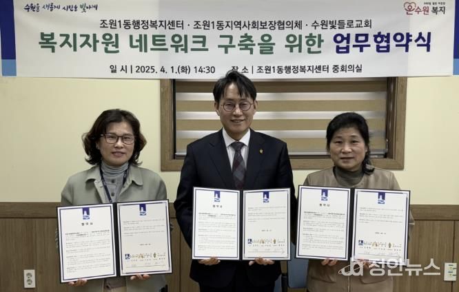 정안뉴스 기자 | 수원시 장안구 조원1동은 지난 1일, 조원1동과 조원1동 지역사회보장협의체가 관내 ‘수원빛들로교회’와 복지자원 네트워크 구축을 위한 업무협약을 체결했다고 밝혔다.