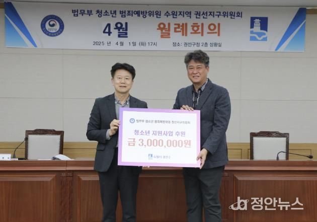 정안뉴스 기자 | 수원시 권선구는 지난 1일, 청소년 범죄예방위원회 권선지구위원회가 지원하는 ‘청소년 사업 후원금 전달식’을 가졌다.