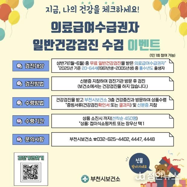 정안뉴스 기자 | 부천시는 의료급여수급권자의 무료 국가건강검진 수검을 독려하기 위해 일반건강검진 수검 이벤트를 진행한다고 2일 밝혔다.