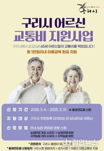 정안뉴스 기자 | 구리시가 4월부터 구리시 거주 65세 이상 어르신에게 연간 12만원 (분기별 3만원)의 교통비를 지원한다.
