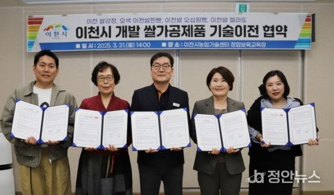 정안뉴스 기자 | 이천시 농업기술센터는 지난 1일 이천시 연구개발과 농산가공팀에서 자체 개발한 쌀 가공제품에 대한 기술 이전 협약식을 개최했다.