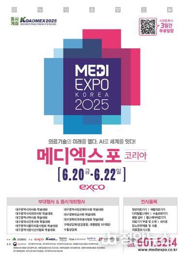 정안뉴스 안정주 기자 | 디지털과 AI 트렌드를 반영한 첨단의료기기 전시, 학술대회, 수출·투자상담회 등 의료산업분야 지역 최대 전시회인 ‘2025 메디엑스포 코리아’가 6월 20일부터 6월 22일까지 대구 엑스코에서 개최된다.