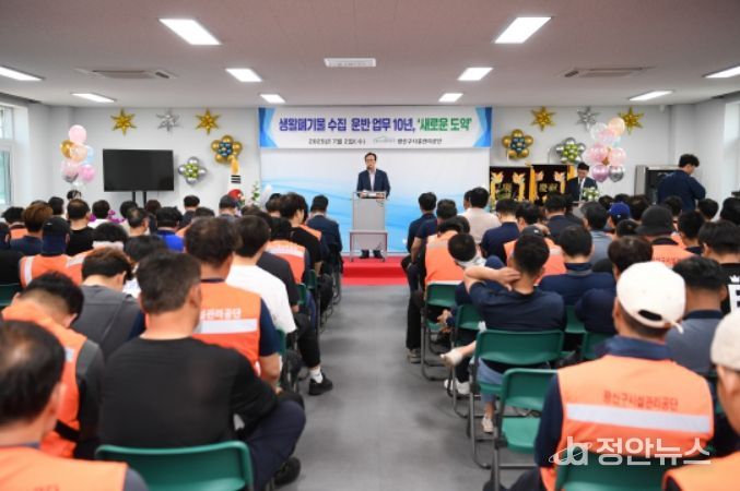 정안뉴스 안정주 기자 | 광주광역시 광산구시설관리공단은 '생활폐기물 수집·운반 업무 수탁 10주년'을 맞이하여 2일, 생활환경종합센터(차고지)에서 김석웅 광산구 부구청장, 김명수 광산구의회 의장을 비롯한 광산구 의원 등 내외 귀빈과 환경직 180여명이 참석한 가운데 성황리에 기념행사를 마쳤다.