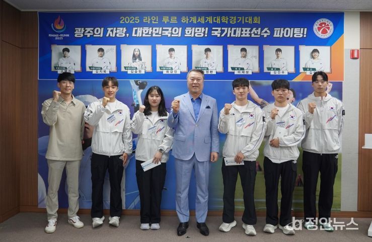 정안뉴스 안정주 기자 | 광주광역시체육회(회장 전갑수)가 세계 대학생들의 스포츠 축제인 ‘2025 라인-루르 하계세계대학경기대회(유니버시아드)’에 참가하는 광주 소속 선수단을 격려했다.