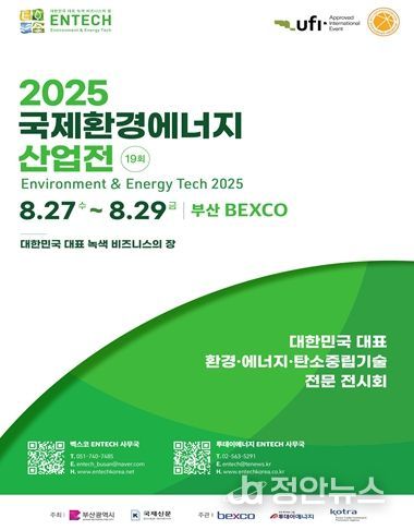 정안뉴스 황정혜 기자 | 부산시(시장 박형준)는 오는 27일부터 29일까지 3일간 벡스코 제2전시장에서 대한민국 대표 녹색 비즈니스의 장인 '2025 국제환경에너지산업전(ENTECH 2025)'을 개최한다고 밝혔다.