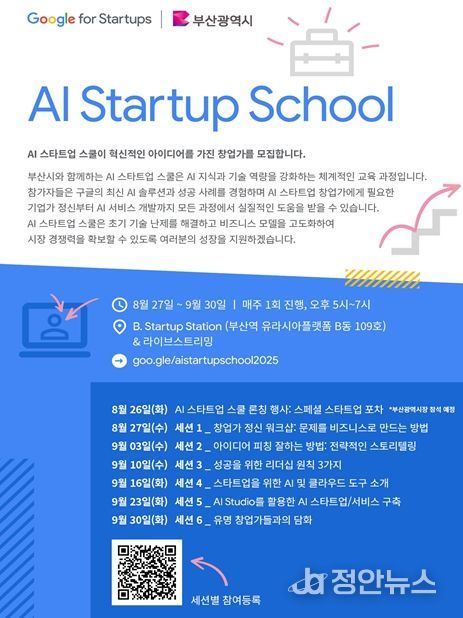 정안뉴스 황정혜 기자 | 부산시는 오늘(26일) 오후 5시 광안리 '브롱스 브루잉컴퍼니'에서 2025년 구글(Google for Startups) '에이아이(AI) 스타트업 스쿨' 출범을 기념하여 '스페셜 스타트업 포차'를 개최한다고 밝혔다.