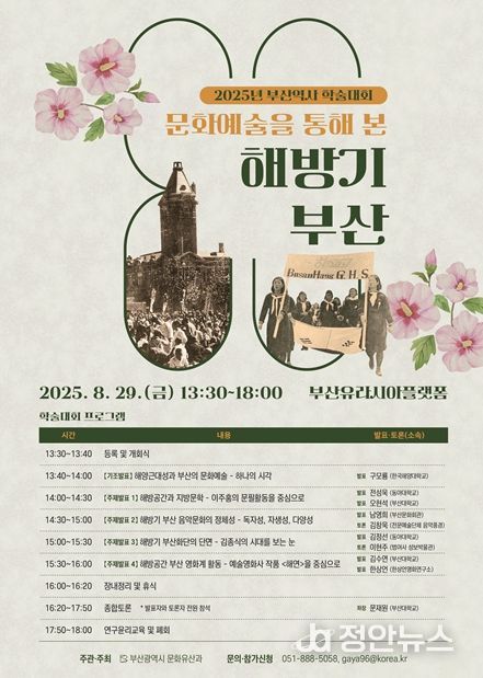 정안뉴스 황정혜 기자 | 부산시는 오는 8월 29일 오후 1시 30분 부산유라시아플랫폼에서 '문화예술을 통해 본 해방기 부산'을 주제로 학술대회를 개최한다고 밝혔다.