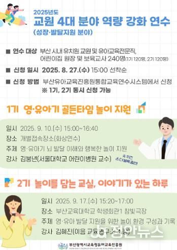정안뉴스 황정혜 기자 | 부산광역시교육청유아교육진흥원은 오는 9월 10일(온라인 연수)과 17일(부산교대 참빛극장) 유치원 및 어린이집 교사 240명을 대상으로 ‘성장·발달 지원 연수’를 운영한다.