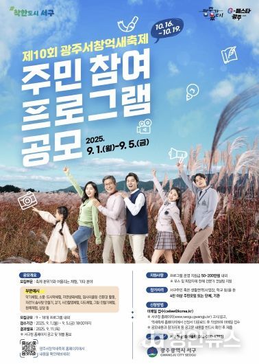 주민참여 프로그램 공모는 9월5일까지 진행되며 서구에 주소를 두거나 생활권을 둔 4인 이상의 모임‧단체‧기관 누구나 신청할 수 있다. 모집 분야는 악기, 다도, 원예, 사진, 업사이클링, 반려견 모임 등 다양한 체험활동과 창의적 아이디어 모두 가능하다. 심사는 대표성, 창의성, 대중성, 연계성, 가능성을 기준으로 이뤄진다.