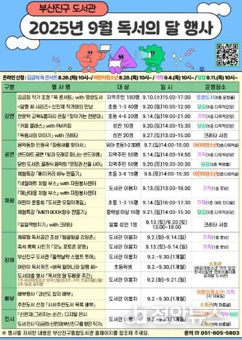 정안뉴스 황정혜 기자 | 부산진구는 ‘9월 독서의 달’을 맞아 한 달간 관내 도서관 6개관과 지역서점 2곳에서 총 23개의 다채로운 독서문화 행사를 운영한다고 밝혔다.