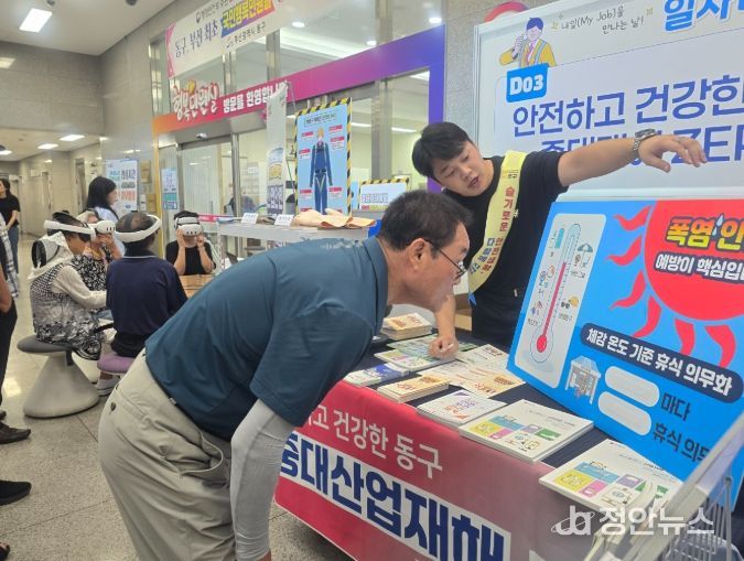 정안뉴스 황정혜 기자 | 부산 동구는 지난 26일, 청사 로비에서 개최된 일자리 박람회에서 ‘안전하고 건강한 동구, 중대재해 ZERO’라는 주제로 '중대산업재해 예방 캠페인'을 진행했다.